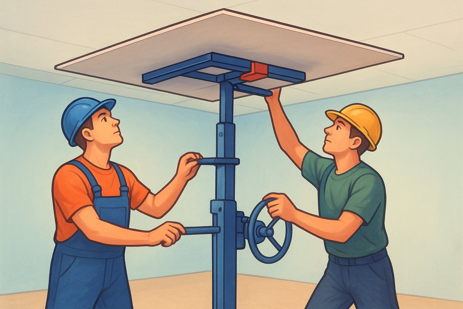 Never attempt to hold ceiling panels overhead by hand without mechanical support, since even a short hold will tire your arms enough to cause misalignment and unsafe drops.