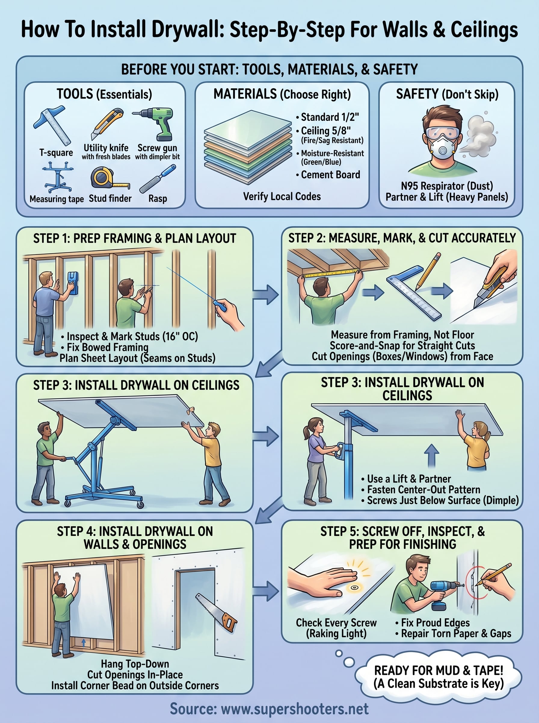 - Drywall lift (rental recommended for ceilings)